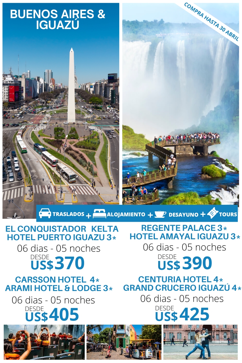 Buenos Aires & Iguazú 06 días – 05 noches Incluye: Traslados Aeropuerto Buenos Aires – Hotel – Aeropuerto Buenos Aires. 03 noches de alojamiento. Plan de alimentación: Desayuno. City Tour Buenos Aires Traslados Aeropuerto Iguazú – Hotel – Aeropuerto Iguazú. 02 noches de alojamiento. Plan de alimentación: Desayuno. Excursión Cataratas Brasil – No incluye entrada….