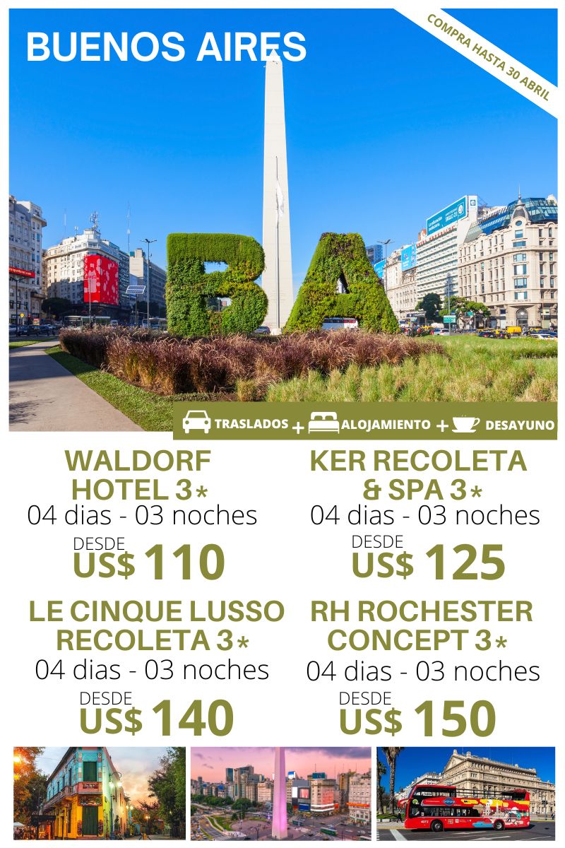 BUENOS AIRES 04 DIAS – 03 NOCHES Traslado Aeropuerto – Hotel – Aeropuerto. 03 noches de alojamiento. Plan de alimentación: Desayuno. Uso de instalaciones del hotel. HOTEL DWB NA TPL NA CHD NA WALDORF HOTEL 3* 110 30 100 20 50 20 KER RECOLETA HOTEL & SPA 3* 125 35 110 20 65 30…