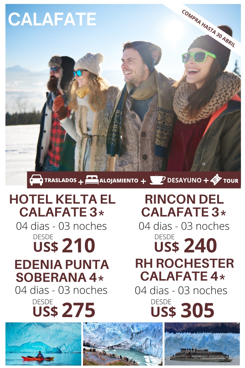 CALAFATE 04 DIAS – 03 NOCHES Traslado Aeropuerto – Hotel – Aeropuerto. 03 noches de alojamiento. Sistema de alimentación: Desayuno Tour por el glaciar Perito Moreno con paseo en barco. HOTEL DWB NA TPL NA NA CHD HOTEL KELTA EL CALAFATE 3* 210 35 210 35 57 75 RINCON DEL CALAFATE 3* 240 35 240…