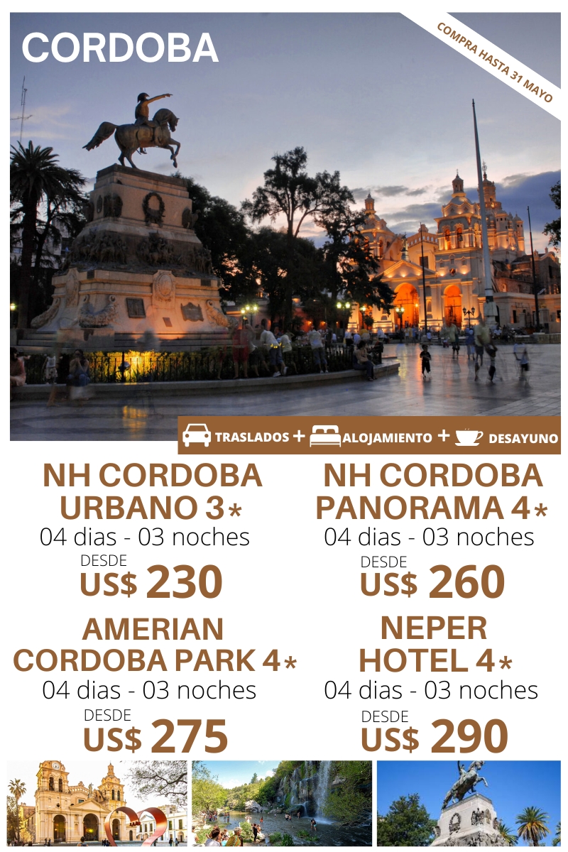 CORDOBA 04 DIAS – 03 NOCHES Traslado Aeropuerto – Hotel – Aeropuerto. 03 noches de alojamiento. Plan de alimentación: Desayuno. Uso de instalaciones del hotel. HOTEL DWB NA TPL NA CHD NA NH CORDOBA URBANO 3* 180 50 170 45 70 30 NH CORDOBA PANORAMA 4* 200 55 190 45 85 30 AMERIAN CORDOBA…