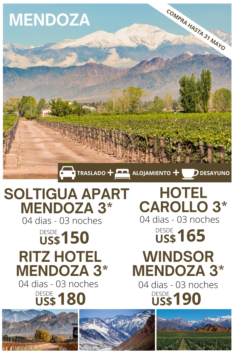MENDOZA 04 DIAS – 03 NOCHES Traslado Aeropuerto – Hotel – Aeropuerto. 03 noches de alojamiento. Plan de alimentación: Desayuno. Tour de medio día por Mendoza. Uso de instalaciones del hotel. HOTEL DWB NA TPL NA CHD NA SOLTIGUA APART HOTEL MENDOZA 3* 150 30 110 20 50 20 HOTEL CAROLLO 3* 165 40 115…