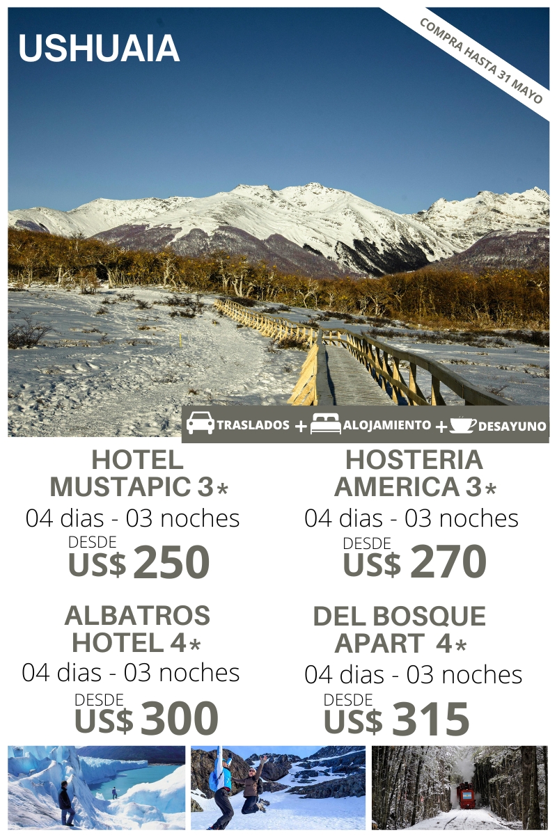 USHUAIA 04 DIAS – 03 NOCHES Traslado Aeropuerto – Hotel – Aeropuerto. 03 noches de alojamiento. Sistema de alimentación: Desayuno Uso de las instalaciones del hotel. HOTEL DWB TPL NA CHD HOTEL MUSTAPIC 3* 250 250 55 90 HOSTERIA AMERICA 3* 270 270 65 85 ALBATROS HOTEL 4* 300 300 70 95 DEL BOSQUE APART…