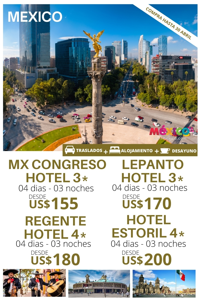 MEXICO 04 DIAS – 03 NOCHES Traslado Aeropuerto – Hotel – Aeropuerto 03 noches de alojamiento. Plan de alimentación: Desayuno HOTEL DWB NA TPL NA CHD NA HOTEL MX CONGRESO 3* 155 50 155 55 55 13 LEPANTO 3* 170 55 170 60 70 15 REGENTE HOTEL 4* 180 60 180 70 75 19 HOTEL…