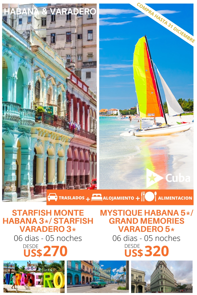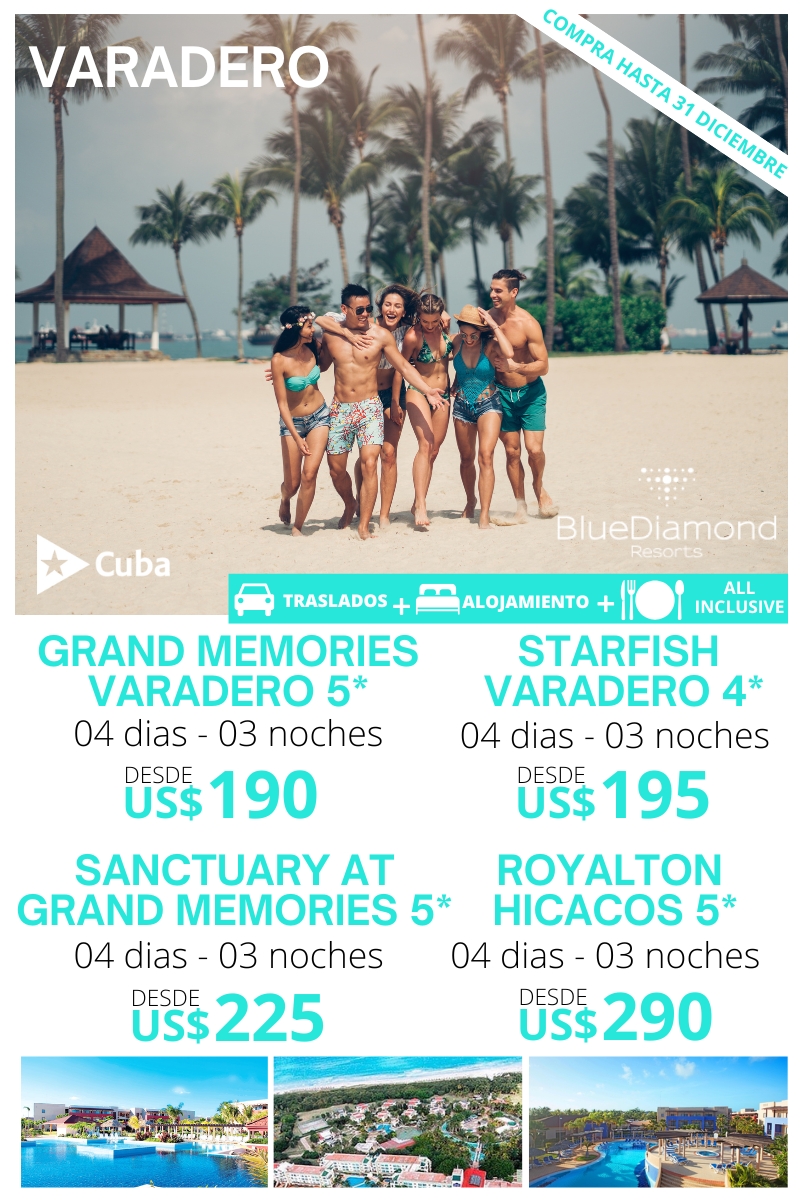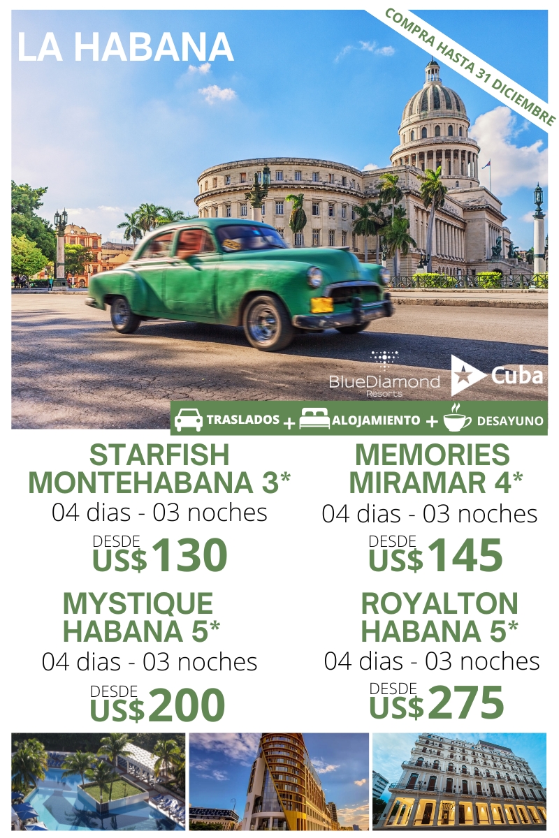 Blue Diamond Habana & Varadero (06 días/ 05 noches) Traslado Aeropuerto – La Habana. 02 noches de alojamiento. Plan de alimentación: Desayuno. Traslado La Habana – Varadero – Aeropuerto La Habana. 03 noches de alojamiento. Plan de alimentación: All Inclusive. Uso de las instalaciones del hotel. HOTEL DWB NA TPL NA CHD NA STARFISH…