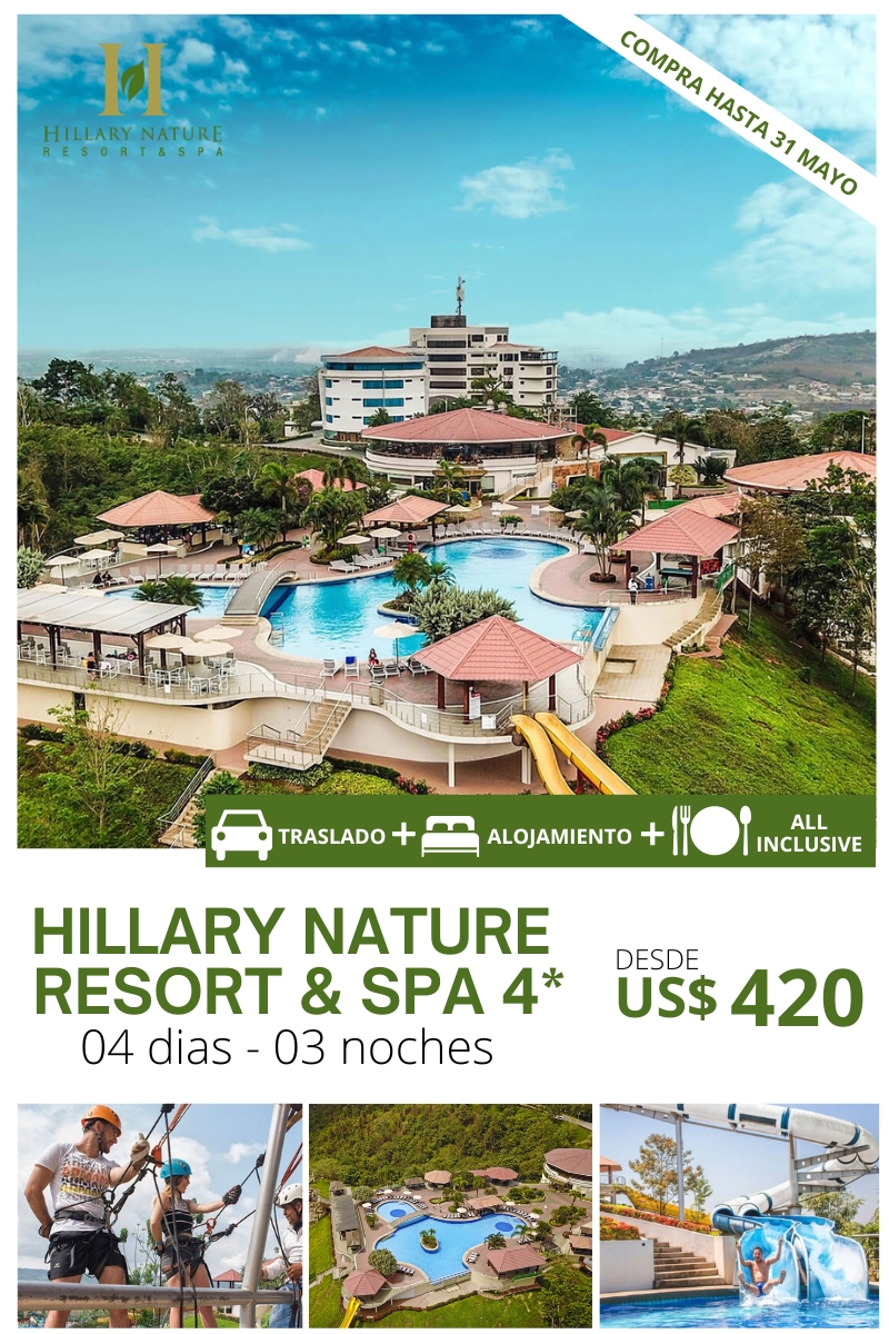Hillary Nature Resort & spa 04 DIAS – 03 NOCHES ARENILLAS – ECUADOR Traslado Aeropuerto TBP – Hotel – Aeropuerto TBP. 03 noches de alojamiento. Sistema de alimentación: All Inclusive. Uso de las instalaciones del hotel.   HOTEL SGL NA DWB NA TPL NA CHD NA Hillary Nature Resort Spa 4* 580 160 420 110…
