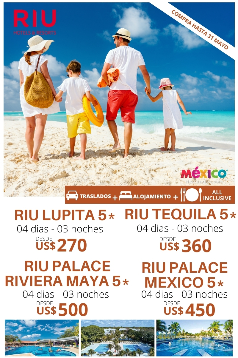 RIU RIVIERA MAYA 04 DIAS – 03 NOCHES Traslado Aeropuerto – Hotel – Aeropuerto 03 noches de alojamiento. Plan de alimentación: All Inclusive. Uso de las instalaciones del hotel. HOTEL DWB NA TPL NA CHD NA RIU LUPITA 5* 270 80 260 75 135 40 RIU TEQUILA 5* 360 105 340 100 170 55 RIU…
