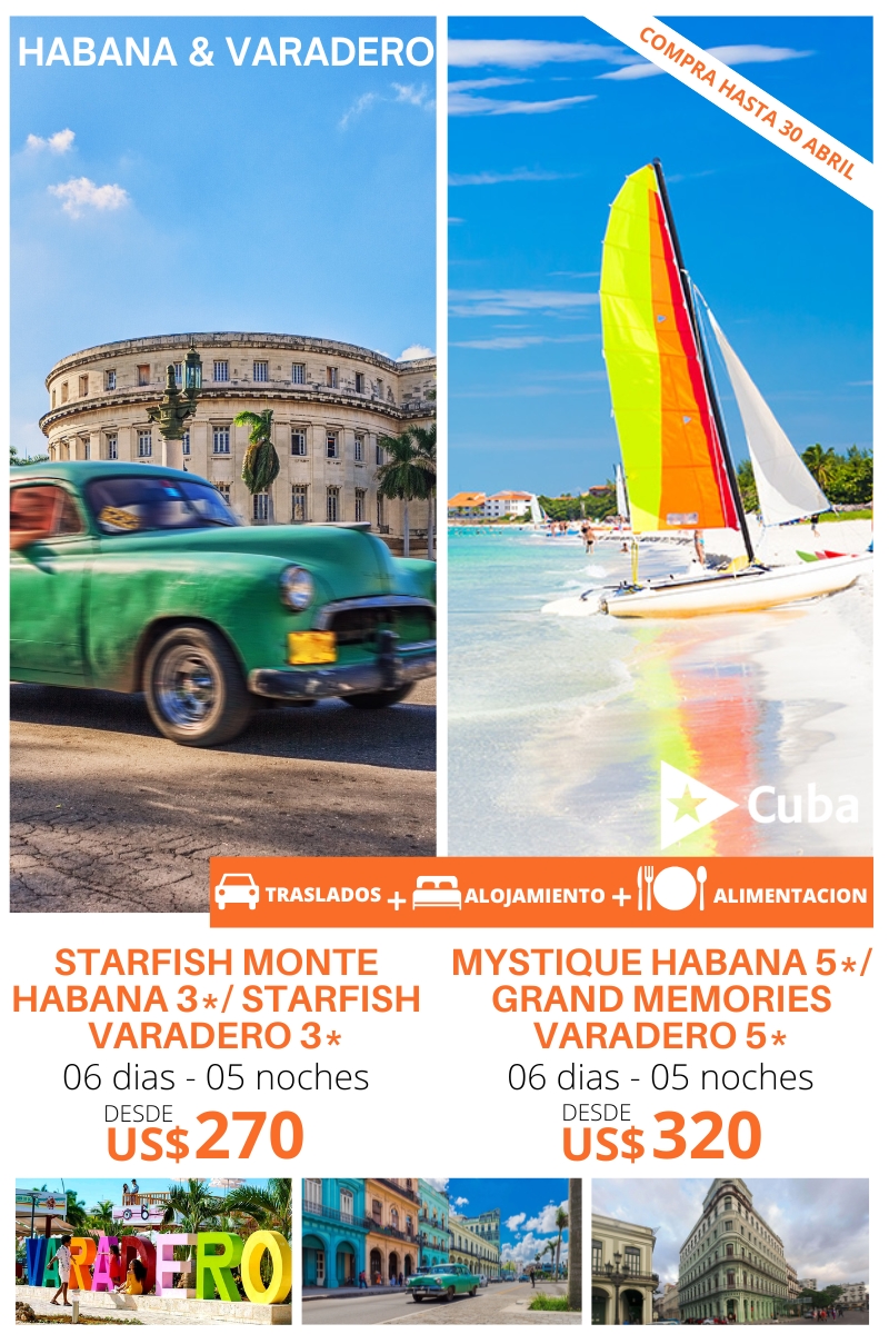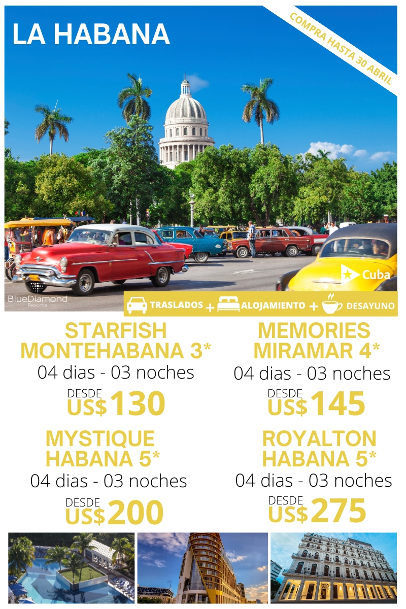 Blue Diamond Habana & Varadero (06 días/ 05 noches) Traslado Aeropuerto – La Habana. 02 noches de alojamiento. Plan de alimentación: Desayuno. Traslado La Habana – Varadero – Aeropuerto La Habana. 03 noches de alojamiento. Plan de alimentación: All Inclusive. Uso de las instalaciones del hotel. HOTEL DWB NA TPL NA CHD NA STARFISH…