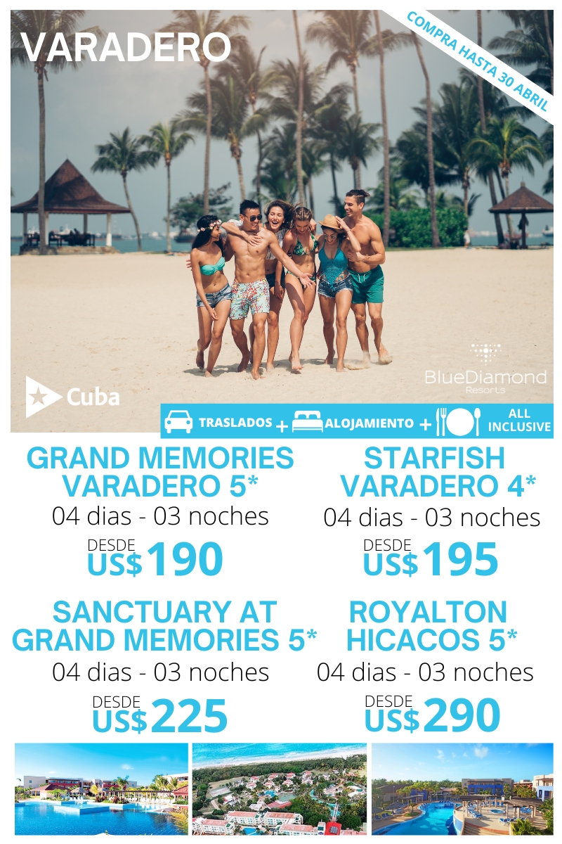 Blue Diamond Varadero 04 DIAS – 03 NOCHES Traslado Aeropuerto – Hotel – Aeropuerto 03 noches de alojamiento. Plan de alimentación: All Inclusive Uso de las instalaciones del hotel. HOTEL DWB NA TPL NA CHD NA GRAND MEMORIES VARADERO 5* 190 50 180 85 115 25 STARFISH VARADERO 4* 195 50 190 50 95…
