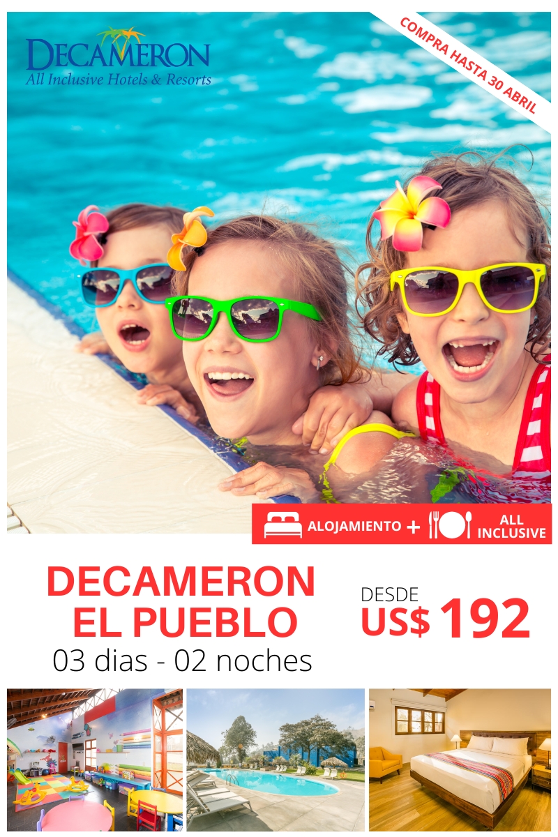 DECAMERON – EL PUEBLO 03 DIAS – 02 NOCHES 02 noches de alojamiento. Plan de alimentación: All Inclusive. Desayunos, almuerzos y cenas tipo buffet. Snacks y piqueos, bebidas alcohólicas nacionales, y refrescos ilimitados. Programación de actividades diarias. Shows y entretenimiento nocturno. Uso de las instalaciones del hotel. VIGENCIA SGL NA DBL TPL NA CUA NA…