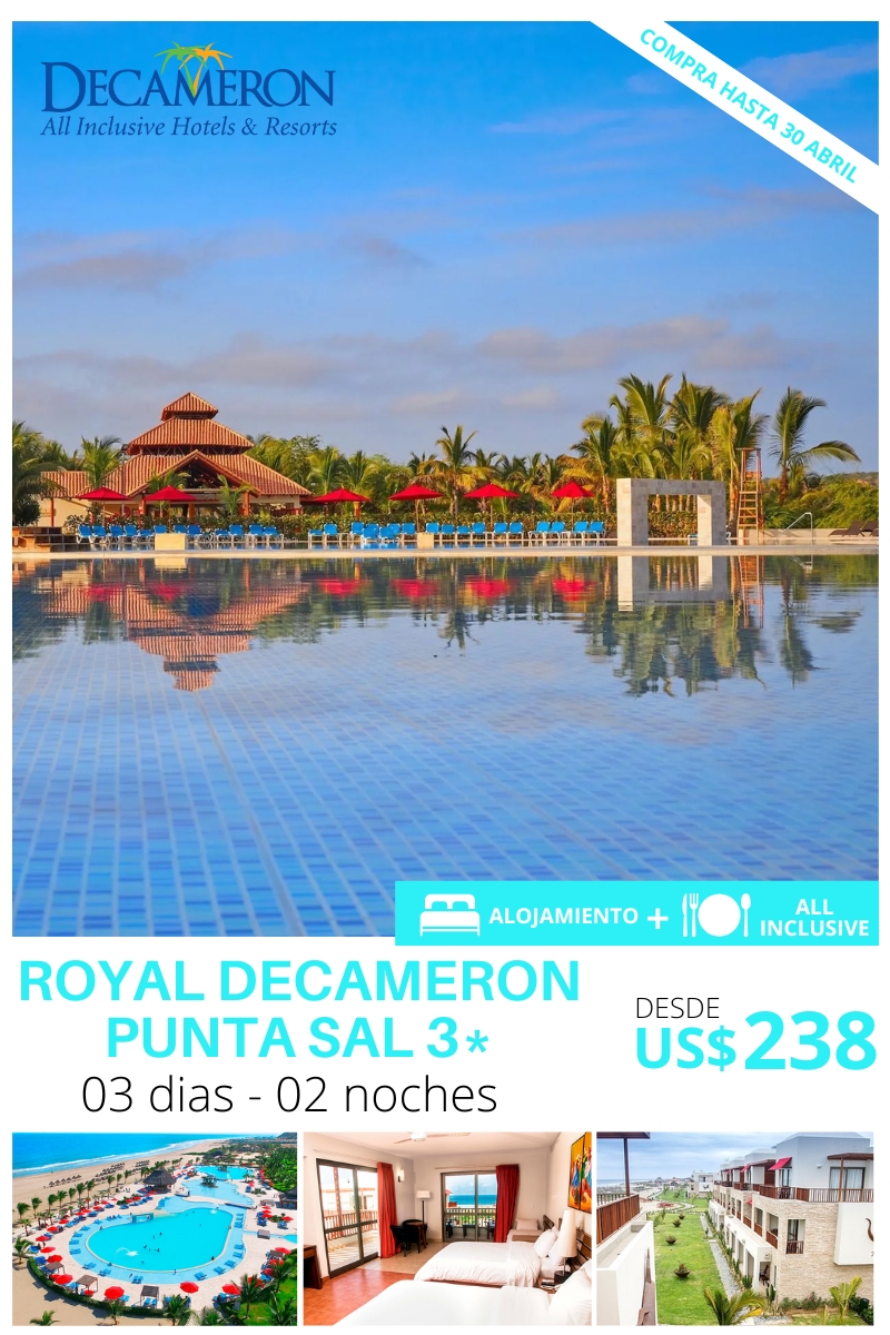 ROYAL DECAMERON PUNTA SAL 03 DIAS – 02 NOCHES 02 noches de alojamiento. Plan de alimentación: All Inclusive. Desayunos, almuerzos y cenas tipo buffet. Snacks y piqueos, bebidas alcohólicas nacionales, y refrescos ilimitados. Programación de actividades diarias. Shows y entretenimiento nocturno. Uso de las instalaciones del hotel. VIGENCIA SGL NA DBL TPL NA CPL…