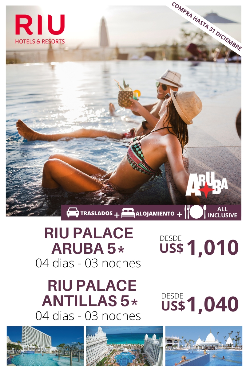 RIU ARUBA 04 DIAS – 03 NOCHES Traslado Aeropuerto – Hotel – Aeropuerto 03 noches de alojamiento. Plan de alimentación: All Inclusive Uso de las instalaciones del hotel. HOTEL DWB NA TPL NA CHD NA RIU PALACE ANTILLAS 5* 1,040 330 990 310 — — RIU PALACE ARUBA 5* 1,010 320 960 310 515…