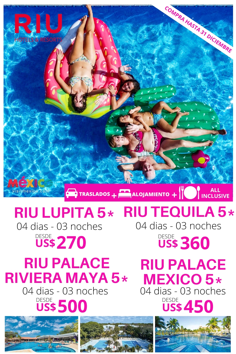 RIU RIVIERA MAYA 04 DIAS – 03 NOCHES Traslado Aeropuerto – Hotel – Aeropuerto 03 noches de alojamiento. Plan de alimentación: All Inclusive. Uso de las instalaciones del hotel. HOTEL DWB NA TPL NA CHD NA RIU LUPITA 5* 270 80 260 75 135 40 RIU TEQUILA 5* 360 105 340 100 170 55 RIU…