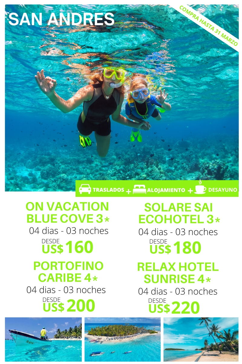 SAN ANDRES 04 DIAS – 03 NOCHES Traslado Aeropuerto – Hotel – Aeropuerto 03 noches de alojamiento. Plan de alimentación: Desayuno. Uso de las instalaciones del hotel.   HOTEL DWB NA TPL NA CHD NA ON VACATION BLUE COVE 3* 160 45 145 40 70 30 SOLARE SAI ECOHOTEL 3* 180 55 165 55 90…