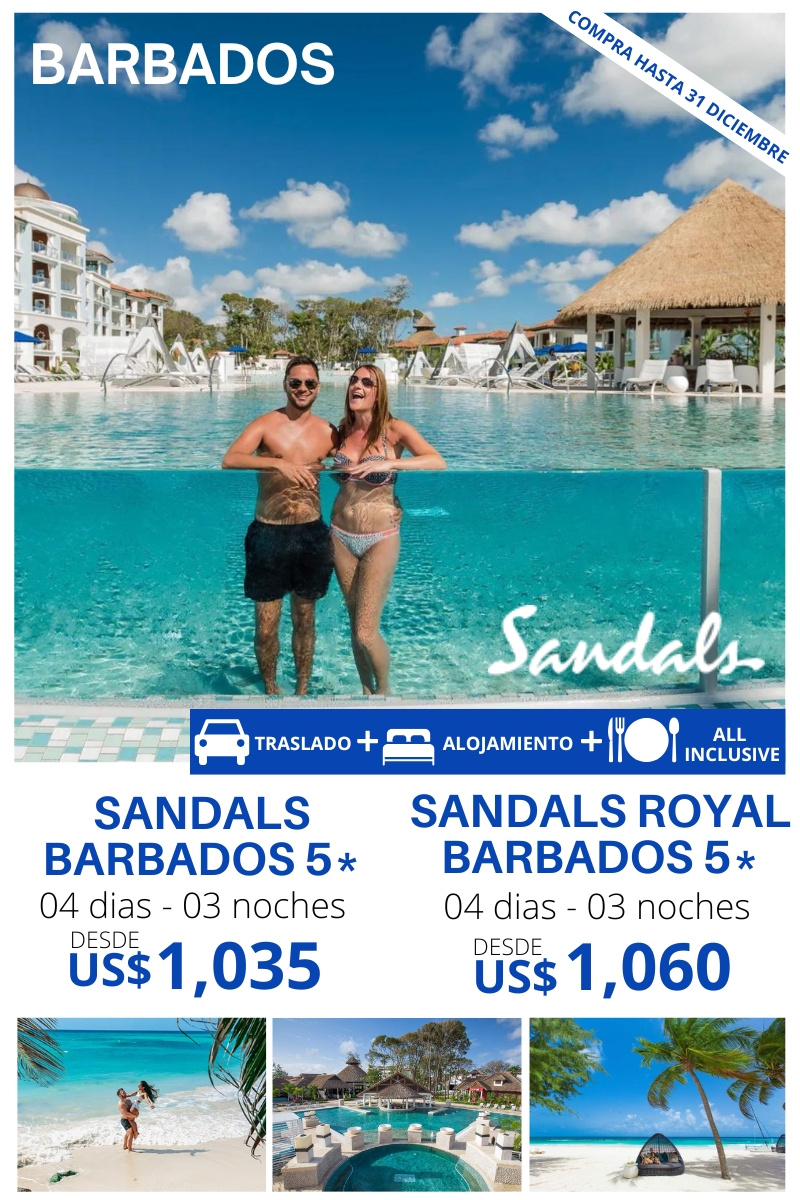 Sandals Hotel & Resort BARBADOS 04 DIAS – 03 NOCHES Traslado Aeropuerto – Hotel – Aeropuerto 03 noches de alojamiento. Plan de alimentación: All Inclusive Uso de las instalaciones del hotel. HOTEL DWB NA SANDALS BARBADOS 5* 1,035 300 SANDALS ROYAL BARBADOS 5* 1,060 330 IMPORTANTE: Comisión 10% del servicio, por pasajero adulto. …