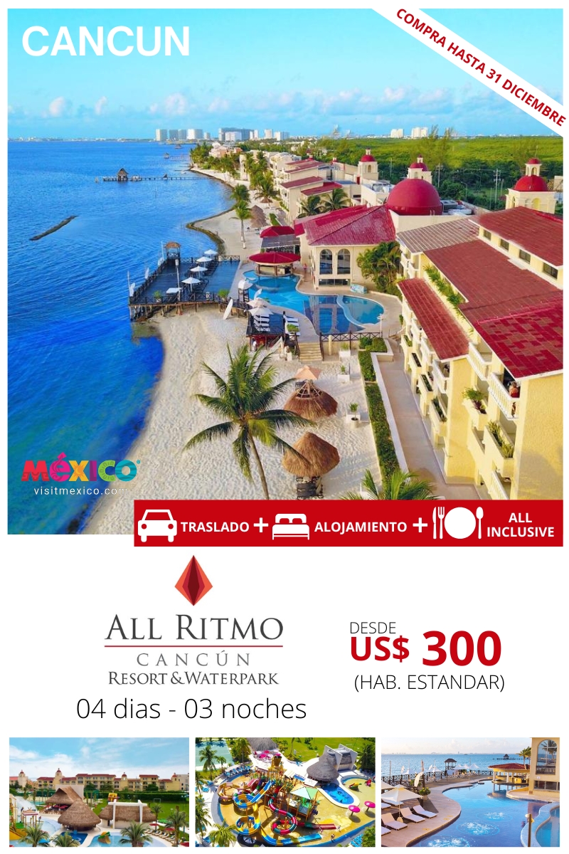 All Ritmo Cancun Resort & Waterpark 04 DIAS – 03 NOCHES Traslado Aeropuerto – Hotel – Aeropuerto 03 noches de alojamiento. Plan de alimentación: All Inclusive Uso de las instalaciones del hotel. HOTEL DWB NA TPL NA CHD NA All Ritmo Cancun Resort & Waterpark 5* 300 95 296 89 105 30 IMPORTANTE:…