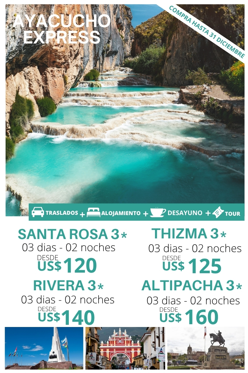 Ayacucho Express 03 DIAS – 02 NOCHES Traslado Aeropuerto – Hotel – Aeropuerto 02 noches de alojamiento con desayunos City Tour Wari Quinua Pampa de Ayacucho Uso de las instalaciones del hotel. HOTEL DWB NA TPL NA CHD NA HOTEL SANTA ROSA 3* 120 42 110 25 110 25 THIZMA HOTELES 3* 125 30…