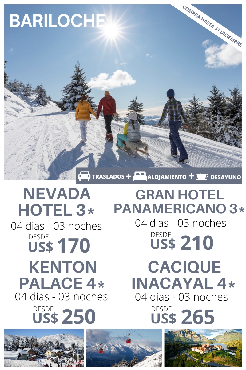 BARILOCHE 04 DIAS – 03 NOCHES Traslado Aeropuerto – Hotel – Aeropuerto. 03 noches de alojamiento. Sistema de alimentación: Desayuno. Tour de medio día por el Cerro Campanario y la península Llao Llao. Uso de instalaciones del hotel. HOTEL DWB NA TPL NA CHD NEVADA HOTEL 3* 170 40 160 35 90 GRAN HOTEL…