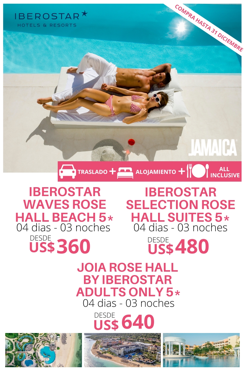 JAMAICA IBEROSTAR HOTELS & RESORTS 04 DIAS – 03 NOCHES INCLUYE: Traslado Aeropuerto – Hotel – Aeropuerto 03 noches de alojamiento. Plan de alimentación: All Inclusive Uso de las instalaciones del hotel. HOTEL DWB NA TPL NA CHD NA IBEROSTAR WAVES ROSE HALL BEACH 5* 360 115 330 100 175 55 IBEROSTAR SELECTION ROSE…