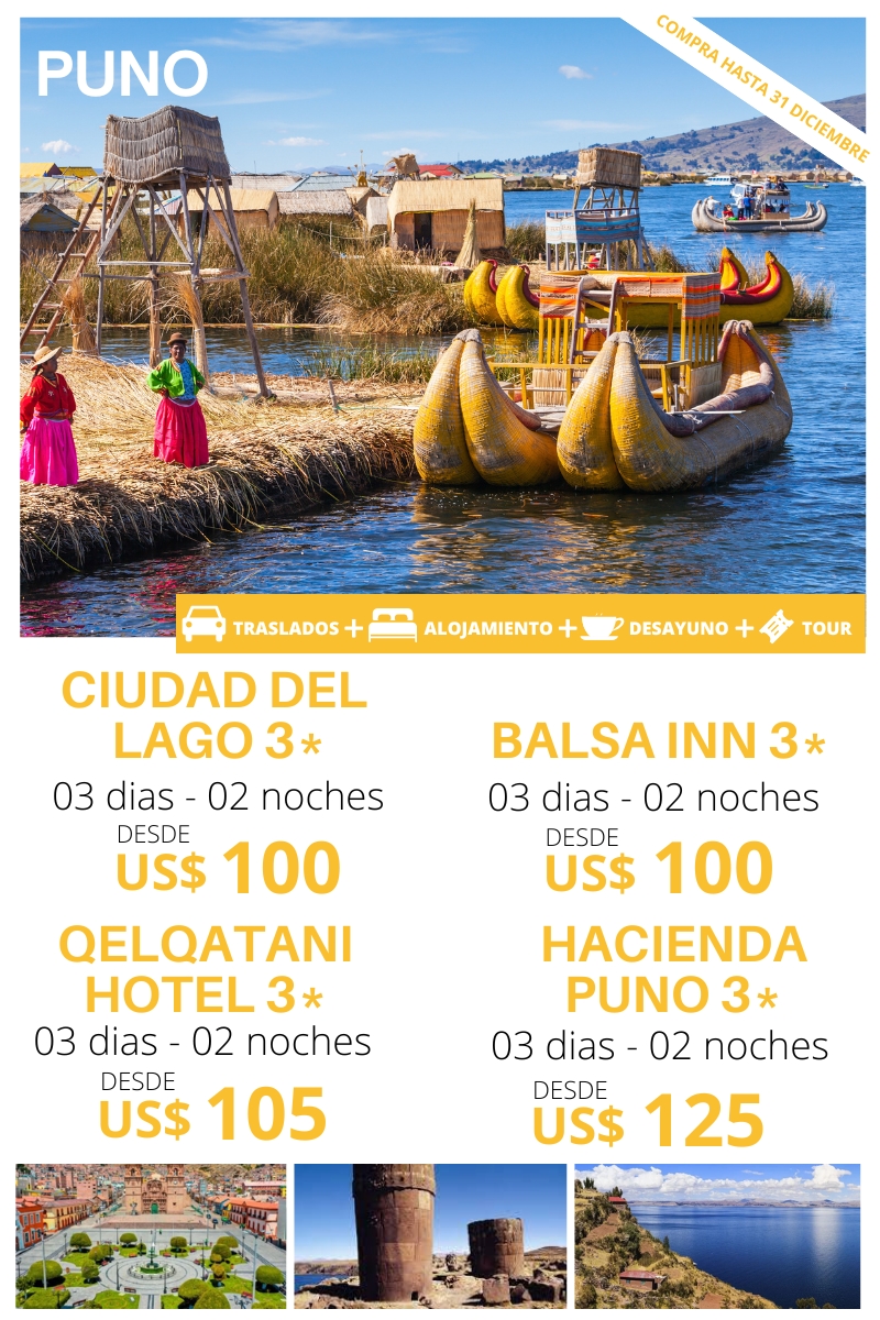 PUNO EXPRESS 03 DIAS – 02 NOCHES Traslado Aeropuerto – Hotel – Aeropuerto 02 noches de alojamiento. Plan de alimentación: Desayuno. Tour a Sillustani Uso de las instalaciones del hotel. HOTEL DWB NA TPL NA CHD NA HOTEL CIUDAD DEL LAGO 3* 100 30 95 25 50 25 BALSA INN 3* 100 30 95…