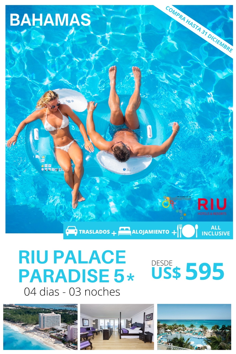 RIU BAHAMAS 04 DIAS – 03 NOCHES Traslado Aeropuerto – Hotel – Aeropuerto 03 noches de alojamiento. Plan de alimentación: All Inclusive Uso de las instalaciones del hotel. HOTEL DWB NA TPL NA CHD NA RIU PALACE PARADISE ISLAND 5* 595 180 570 175 — — IMPORTANTE: Comisión 10% del servicio, por pasajero…