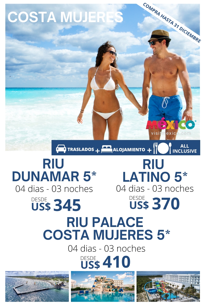 RIU COSTA MUJERES 04 DIAS – 03 NOCHES Traslado Aeropuerto – Hotel – Aeropuerto 03 noches de alojamiento. Plan de alimentación: All Inclusive Uso de las instalaciones del hotel. HOTEL DWB NA TPL NA CHD NA RIU DUNAMAR 5* 345 105 325 100 165 50 RIU LATINO 5* 370 110 355 175 — —…
