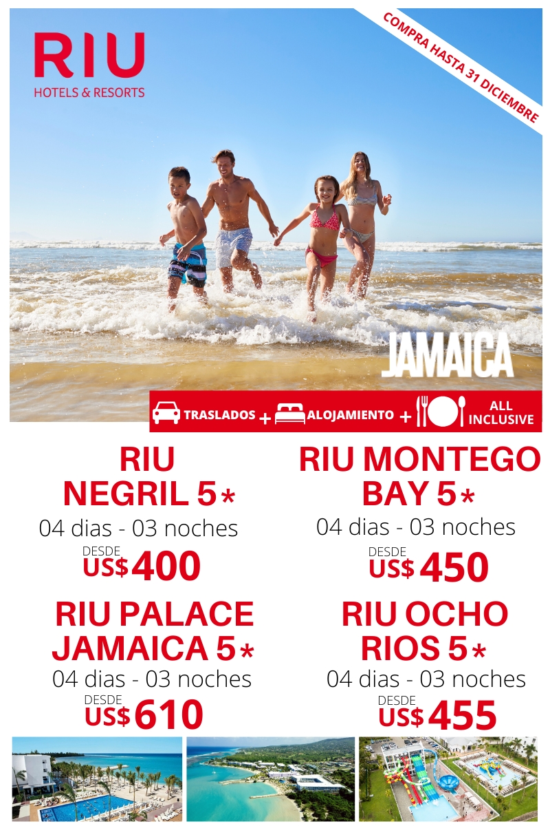 RIU JAMAICA 04 DIAS – 03 NOCHES Traslado Aeropuerto – Hotel – Aeropuerto 03 noches de alojamiento. Plan de alimentación: All Inclusive Uso de las instalaciones del hotel. HOTEL DWB NA TPL NA CHD NA RIU NEGRIL 5* 400 120 380 100 200 50 RIU MONTEGO BAY 5* 450 140 440 130 — —…
