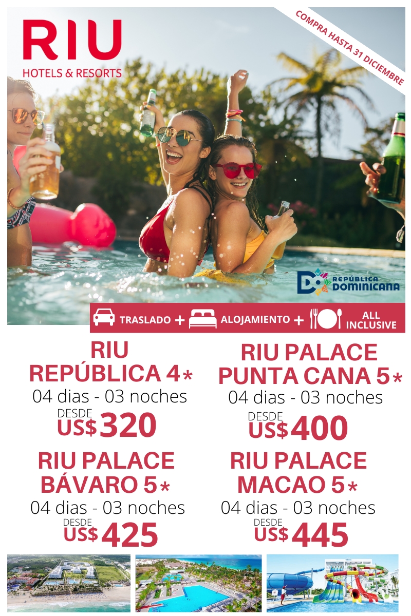 RIU PUNTA CANA 04 DIAS – 03 NOCHES Traslado Aeropuerto – Hotel – Aeropuerto 03 noches de alojamiento. Plan de alimentación: All Inclusive Uso de las instalaciones del hotel. HOTEL DWB NA TPL NA CHD NA RIU REPÚBLICA 4* 320 100 305 95 — — RIU PALACE PUNTA CANA 5* 400 125 375 120…