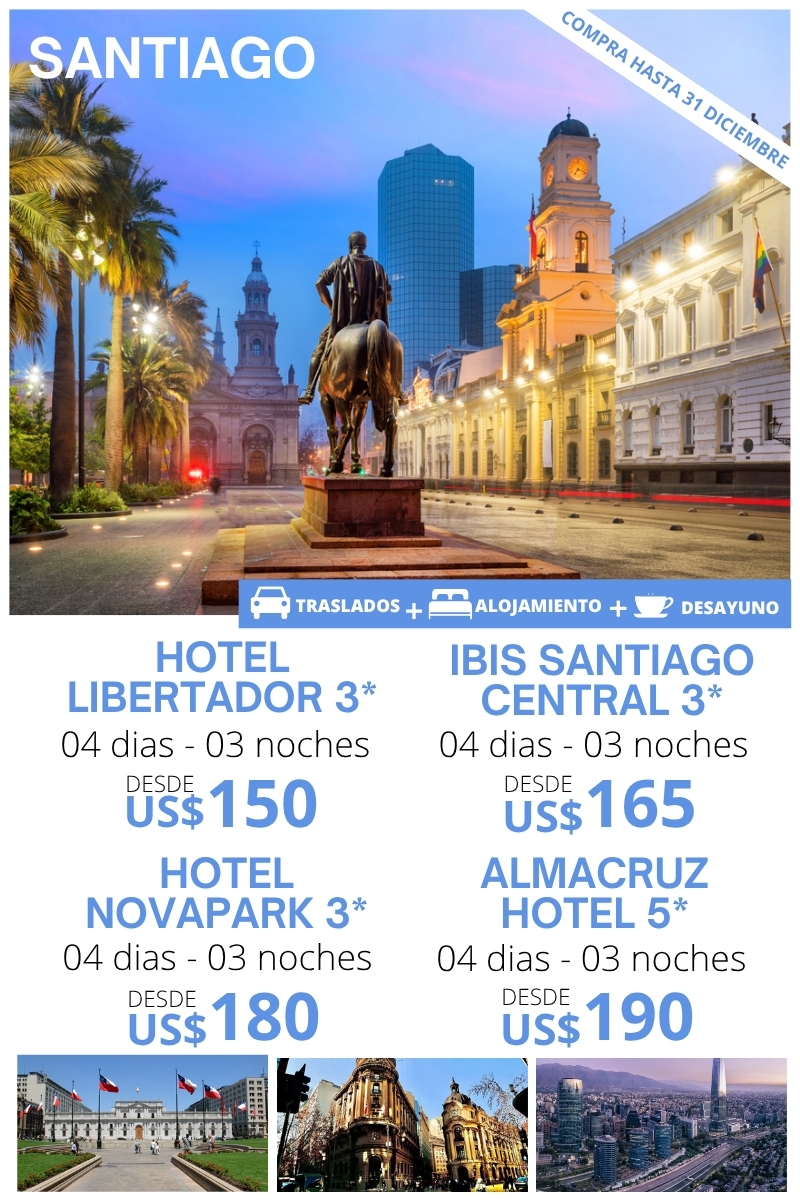 SANTIAGO DE CHILE 04 DIAS – 03 NOCHES Traslado Aeropuerto – Hotel – Aeropuerto 03 noches de alojamiento. Plan de alimentación: Desayuno Uso de las instalaciones del hotel. HOTEL DWB NA TPL NA CHD NA HOTEL LIBERTADOR 3* 150 30 140 35 50 20 IBIS SANTIAGO ESTACIÓN CENTRAL 3* 165 35 165 35 50…