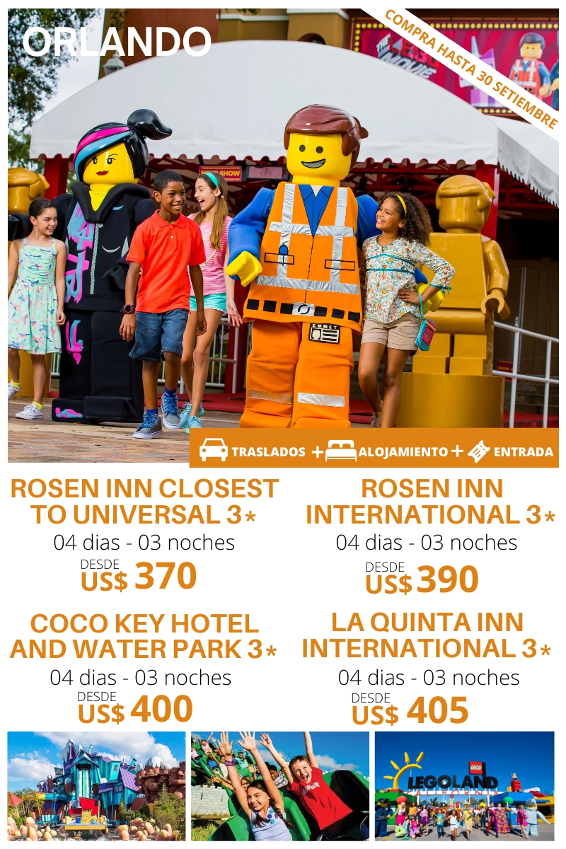 ORLANDO LEGOLAND 04 DIAS – 03 NOCHES Traslado Aeropuerto – Hotel – Aeropuerto 03 noches de alojamiento. Plan de alimentación: Solo Alojamiento. LEGOLAND Florida Resort. Uso de las instalaciones del hotel. HOTEL DWB NA TPL NA CHD NA ROSEN INN CLOSEST TO UNIVERSAL 3* 370 105 350 120 110 35 ROSEN INN INTERNATIONAL 3*…