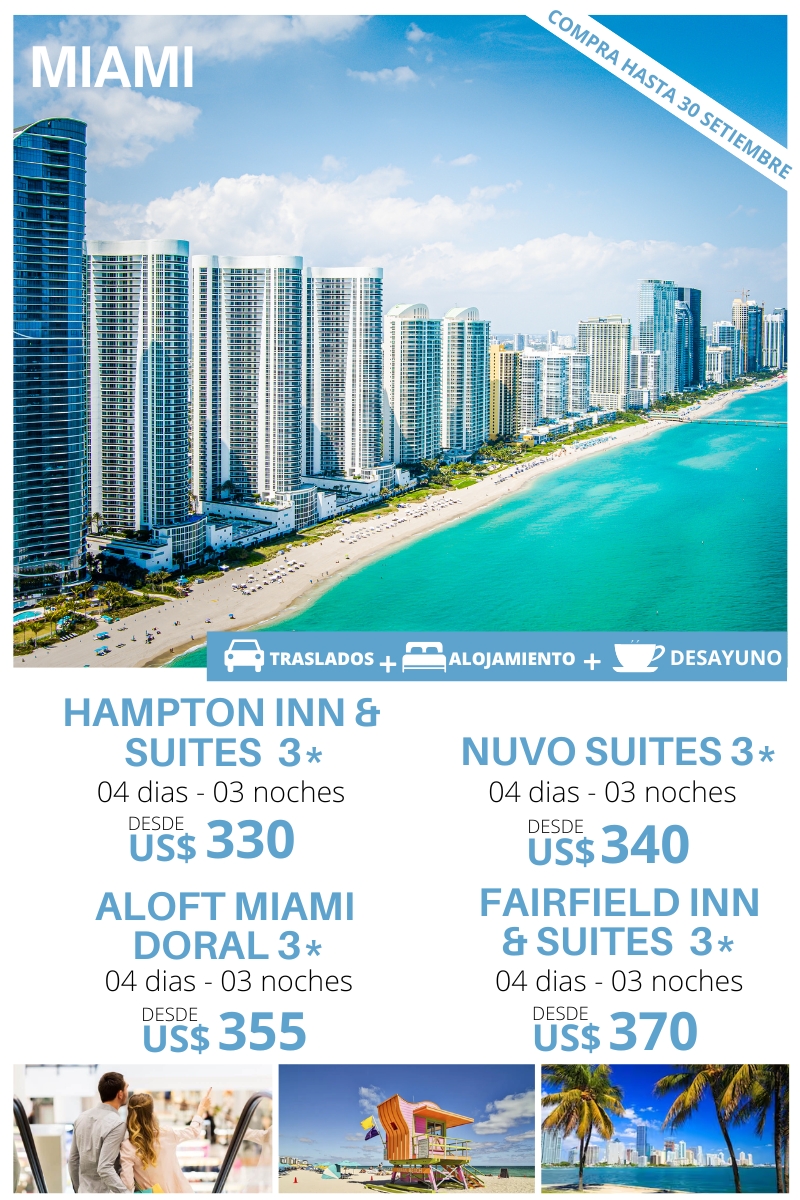 MIAMI 04 DIAS – 03 NOCHES Traslado Aeropuerto – Hotel – Aeropuerto 03 noches de alojamiento. Plan de alimentación: Desayuno. Uso de las instalaciones del hotel. HOTEL DWB NA TPL NA CHD NA HAMPTON INN & SUITES MIAMI-DORAL/DOLPHIN MALL 3* 330 100 300 95 150 55 NUVO SUITES 3* 340 105 305 100 160…
