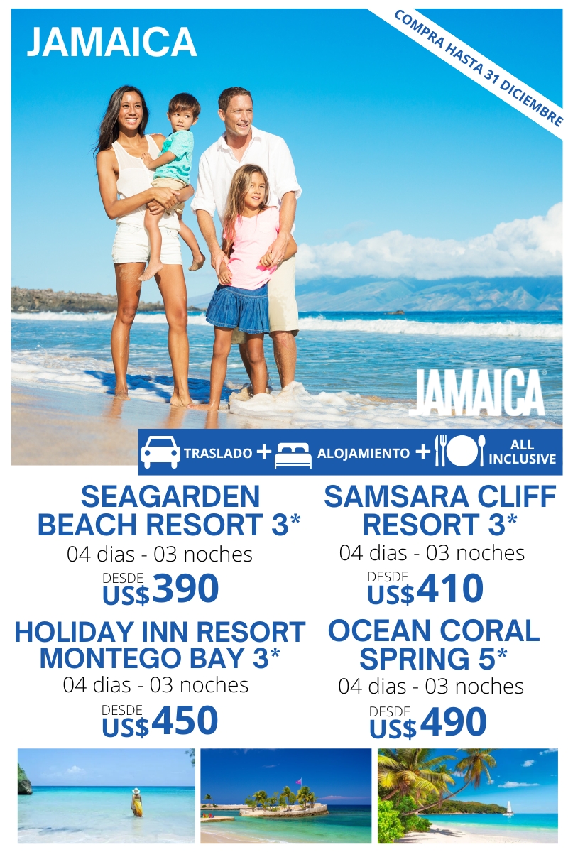 JAMAICA 04 DIAS – 03 NOCHES Traslado Aeropuerto – Hotel – Aeropuerto 03 noches de alojamiento. Plan de alimentación: All Inclusive Uso de las instalaciones del hotel. HOTEL DWB NA TPL NA CHD NA SEAGARDEN BEACH RESORT 3* 390 110 350 95 150 40 SAMSARA CLIFF RESORT 3* 410 140 380 125 195 55…